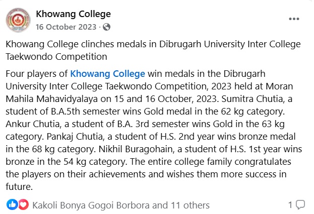 | Khowang College clinches medals in Dibrugarh University Inter College Taekwondo Competition |